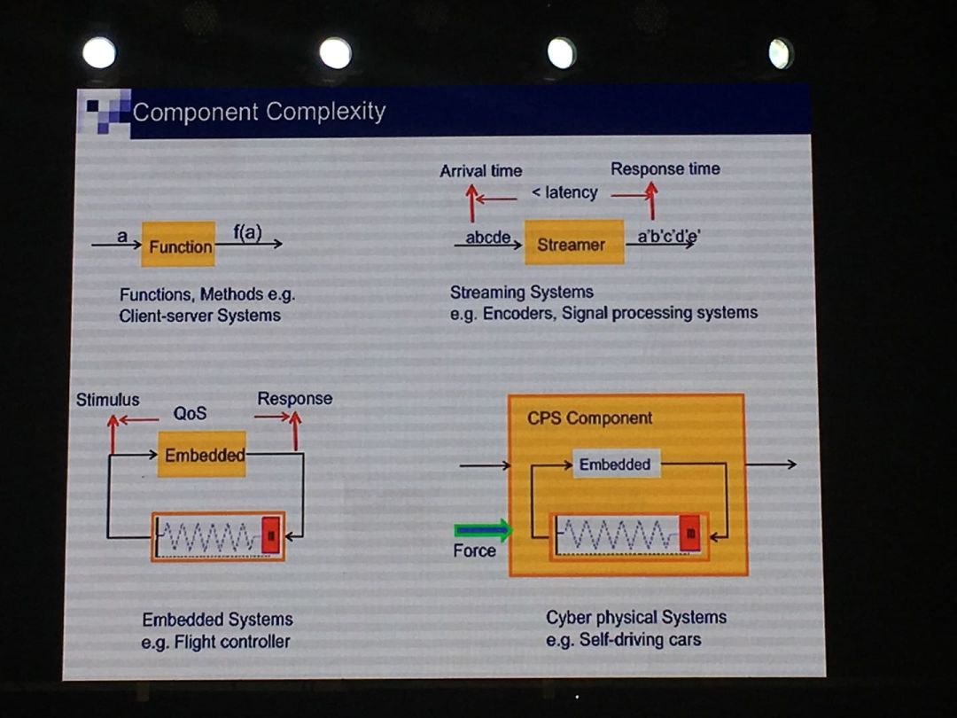 首先,我们有一个函数,给它一个值,得到一个函数结果。在编程时,我们利用函数,这非常简单。软件也是可以非常复杂的,它会有很多行的代码。在三个构架的系统中,有输入和输出,有时的输出是基于历史的输入值的。在一个嵌入系统中,计算机在实际环境中不断地演变,目前,在系统设计方面有了一个新的方向:虚拟物理系统。在虚拟物理系统中,有计算机,也有电子元件。当我们设计这样一个信息物理系统的时候,我们还要利用其它的知识。