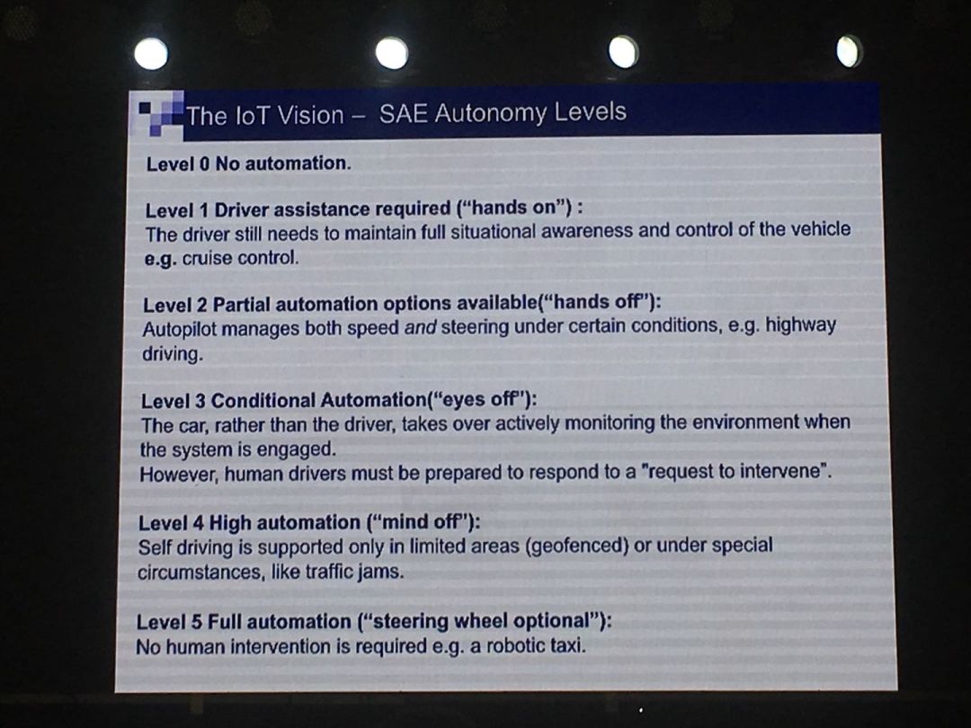 图(下)为无人驾驶车,我们用不同的自主范围和自主水平来判定它的自主化程度,如从 level 0 到 level 5 的阶段(从无自主化到完全自主化)。level5 阶段的无人驾驶车是完全自主化的,它是不受人类干预的,完全由机器人操控的汽车。