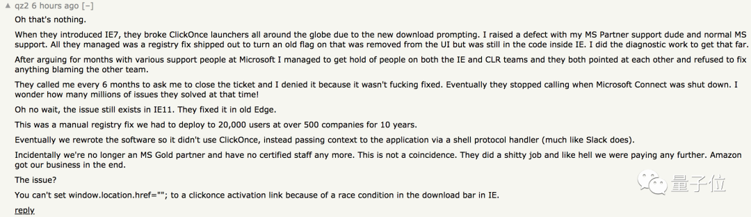 此外,还有用户说,IE7时代时,浏览器和ClickOnce启动器无法兼容,向微软团队反映数月也无果。