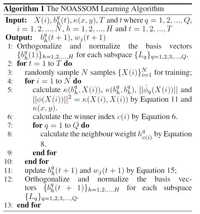 ASSOM 由输入层、子空间层、输出层组成。NOASSOM 比 ASSOM 增加一个非线性正交映射层,用于实现输入层和子空间层的非线性正交映射。为保证映射后的子空间基向量仍然保持正交性,NOASSOM 采用正交约束的核函数: