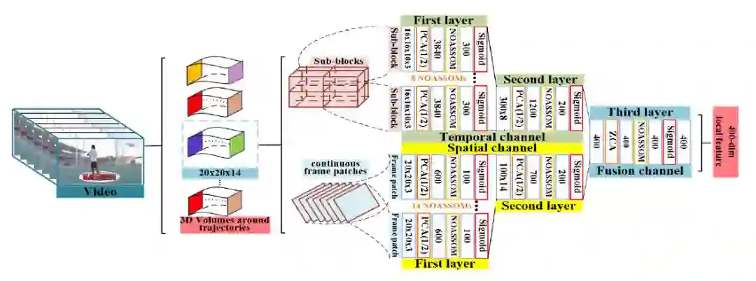 NOASSOM 论文进一步还提出一个层级的 NOASSOM 来提取高层的抽象特征,有效地描述视频中行为轨迹的表观和运动信息,构建了一个层级的 NOASSOM 结构提取视频中的局部行为特征,并使用 FISHER VECTOR 进行聚合编码,采用 SVM 进行分类,如图 2 所示。