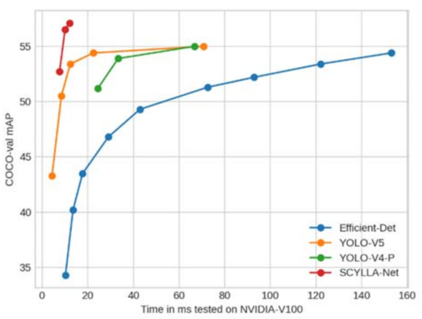 图 10 总结了不同模型与 mAP@0.5:0.95 的推理时间。显然,Scylla-Net 的 mAP 值较高,而模型推理时间远低于比较模型的推理时间。