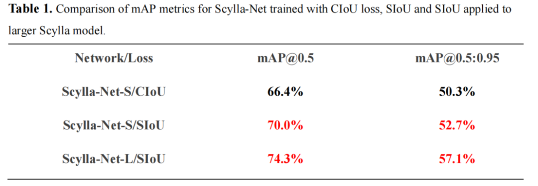 COCO-val 上 SIoU 的 mAP 为 52.7% mAP@0.5:0.95(包括预处理、推理和后处理为 7.6ms)和 70% mAP@0.5,同时 CIoU 为分别只有 50.3% 和 66.4%。
