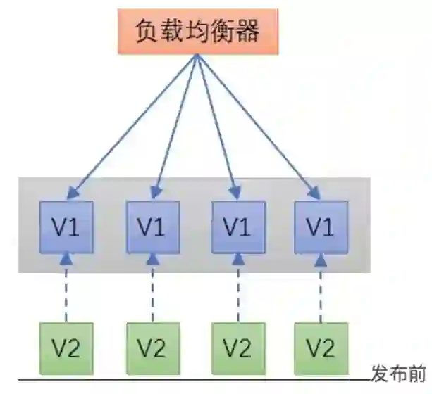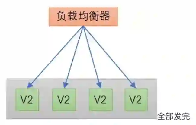 如果金丝测试通过,则把剩余的 V1 版本全部升级为 V2 版本。如果金丝雀测试失败,则直接回退金丝雀,发布失败。