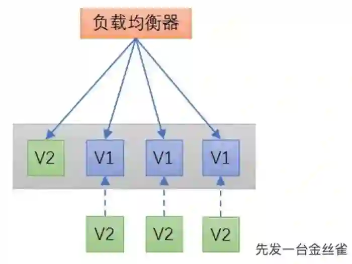 金丝雀发布一般先发 1 台,或者一个小比例,例如 2% 的服务器,主要做流量验证用,也称为金丝雀(Canary)测试(灰度测试)。