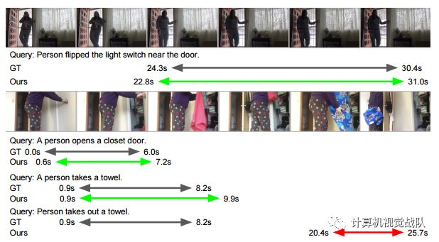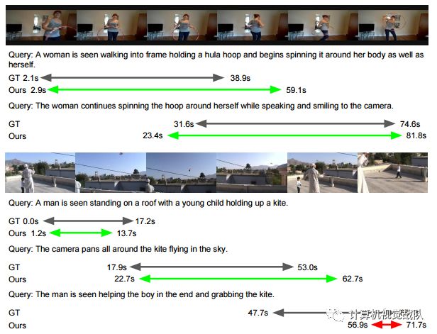 示例检索的定性可视化结果,在Charades-STA数据集(图3)和ActivitynetCaptions数据集(图4)上。与查询相对应的GT剪辑用黑色箭头标记。正确的预测(预测片段的时间与GT的IOU超过0.5)标记为绿色,不正确的预测标记为红色。开始和结束时间以秒为单位。