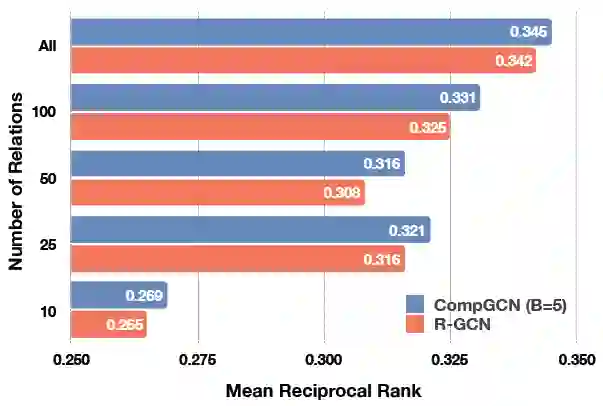 可以看到,即使只用5个基向量,CompGCN的效果也在各种数量关系上全面优于考虑所有关系的R-GCN。