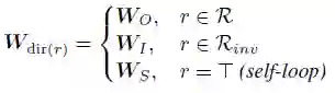 其中x_u和 x_r 分别指代初始的结点和关系的特征,h_v 指代结点v更新后的表示,W_lamba(r)则是特定的关系类型的参数。在CompGCN中,作者用关系的方向的来进行区分: