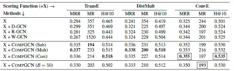 可以看到,在不同的评分函数下,CompGCN都取得了最好的效果。且ConvE+CompGCN(Corr)在所有实验中取得了最好的效果。
