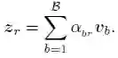 为了避免随着关系数量的增加所带来的参数复杂性,CompGCN使用了一组基来作为可学习的基础向量,而不是为每一个关系都定义一个embedding,如下式所示: