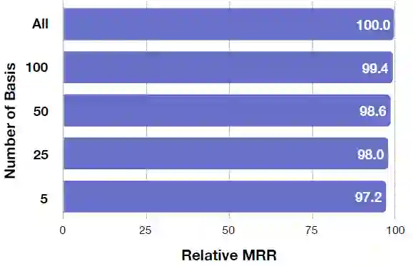 可以看到模型的效果随着基向量的个数而不断提升,当取到100个基向量的时候,模型的效果与为每一种关系单独建立一个embedding的效果几乎一样。在前面的实验中我们可以看到,当取50的时候,CompGCN就能够有不错的表现了,