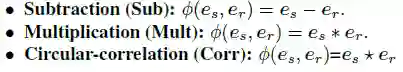 其中N(v)表示结点v的出边相连的结点集合。CompGCN首先对相邻接点以及对应的边进行组合操作,以此来保证特征的维度是线性的,具体的更新公式如下: