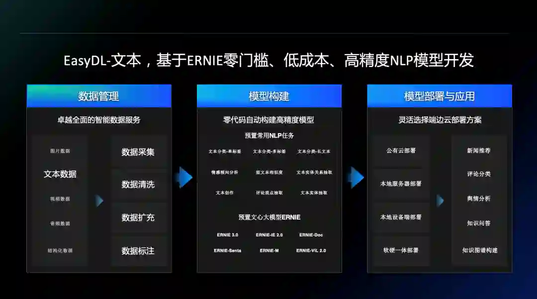 EasyDL NLP近日将文心 ERNIE 大模型「底座」升级到 3.0。这意味着什么?让我们从以下几个方面,看看文心大模型如何使得EasyDL文本能力更强大: