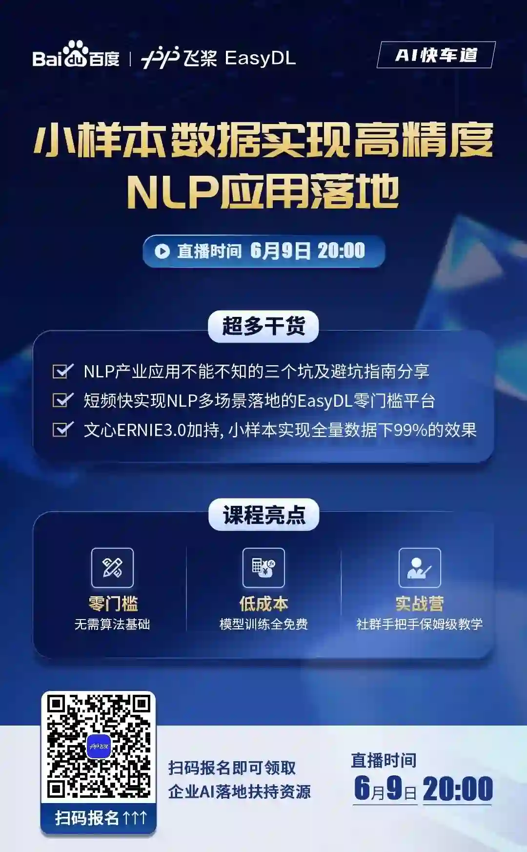 6月9日晚20:00,百度NLP产品经理将带来精彩直播讲解,剖析NLP产业应用开发不能不知的三个坑及相应解决方案,解读EasyDL如何实现NLP产业应用落地,并手把手带您进行项目实战。