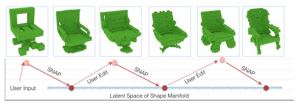 We propose the idea of using a generative adversarial network (GAN) to assist users in designing realworld shapes with a simple interface. Users edit a voxel grid with a Minecraft-like interface. Yet they can execute a SNAP command at any time, which transforms their rough model into a desired shape that is both similar and realistic. They can edit and snap until they are satisfied with the result. The advantage of this approach is to assist novice users to create 3D models characteristic of the training data by only specifying rough edits. Our key contribution is to create a suitable projection operator around a 3D-GAN that maps an arbitrary 3D voxel input to a latent vector in the shape manifold of the generator that is both similar in shape to the input but also realistic. Experiments show our method is promising for computer-assisted interactive modeling。