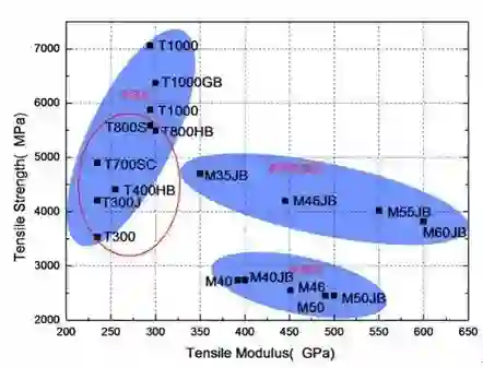 自行车用碳纤维主要使用图中红圈内的几种,直到这两年,国内企业才实现了高端车使用的T800级别碳纤维的量产。