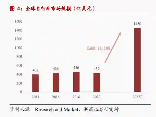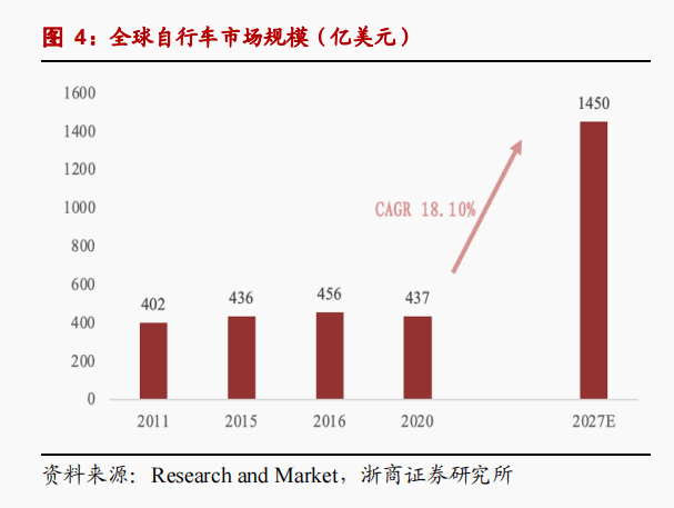 2020年全球自行车市场规模为437亿美元,乐观预计2027年将达到1405亿美元