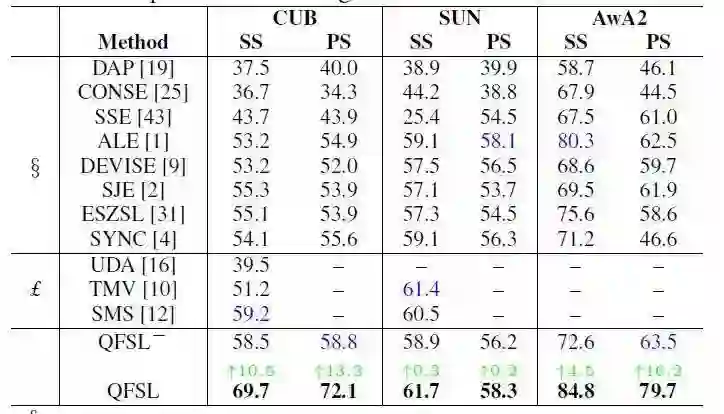 首先我们在传统设置下对我们方法和现有方法。用来做对比的现有方法分为两类:一类是归纳式方法,包括 DAP、CONSE、SSE、ALE、DEVISE、SJE、ESZSL、SYNC;另一类是直推式方法,包含 UDA、TMV、SMS。与此同时,还比较了一个潜在的 baseline(标记为 QFSL-):只用有标注的源数据来训练我们的模型。实验效果如表 1。可以看出,我们的方法大幅度(4.5~16.2%)提升了分类准确度。
