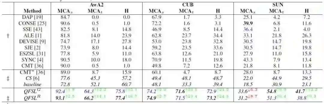 我们在三个数据集上评估了我们的方法。这三个数据集分别为 AwA2,CUB,SUN。在实验中,我们采用属性作为语义空间,用类平均准确度衡量模型效果。