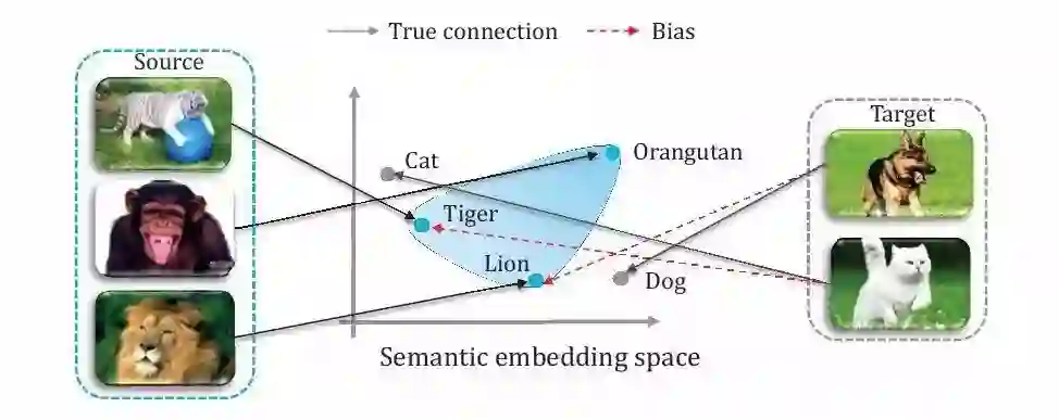 现有的 ZSL 方法在广义设定下的效果远远不如传统设定。这种不良表现的主要原因可以归纳如下:ZSL 通过建立视觉嵌入和语义嵌入之间的联系来实现新的类别的识别。在衔接视觉嵌入和语义嵌入的过程中,大多数现有的 ZSL 方法存在着强偏(strong bias)的问题(如图 1 所示):在训练阶段,视觉图片通常被投影到由源类确定的语义嵌入空间中的几个固定的点。这样就导致了在测试阶段中,在目标数据集中的新类图像倾向于被分到源类当中。