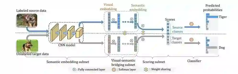得分函数由单个全连接层来实现。它的权重使用源类和目标类的归一化语义:来初始化。和视觉嵌入子网络和视觉-语义衔接子网络不同的是,得分子网络的权重是固定的,在训练阶段不参与更新。通过这种方式,我们的模型将图像