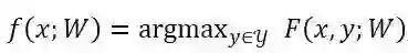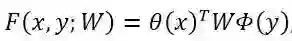 其中 F(∙) 是一个得分函数,其目标是正确的标注比其他不正确的标注具有更高的得分。W 是模型 F(∙) 的参数,F(∙) 通常使用如下的双线性形式: