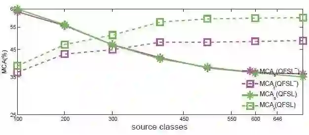 现实世界中,目标类的数量可能远远高于源类数量。然而,大多数现有 ZSL 数据集的源、目标数据划分都违背了这一点。比如,在 AwA2 中,40 个类用来做训练,10 个类用来做测试。我们在实验上给出了随着源数据类别的增加,QFSL 在效果上如何变化。该实验在 SUN 数据集上进行,72 类作为目标类,随机选取剩下的类作为源类。我们尝试了 7 个大小不同的源类集,类的数量分别为 {100,200,300,450,550,600,645}。用这些不同大小的源类作为训练集,测试我们的方法,效果如图 3。由图可以看出,随着类别增加,模型能够学习到更多的知识,其在目标数据集上准确度越来越高。同时,由于源数据和目标数据变得越来越不平衡,强偏问题越来越严重。我们方法能够缓解强偏问题,因而其在效果上的优越性也越来越明显。