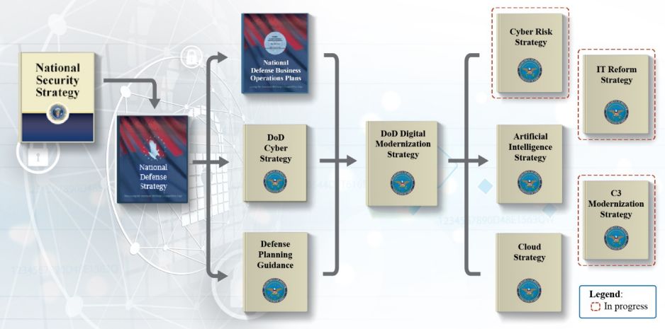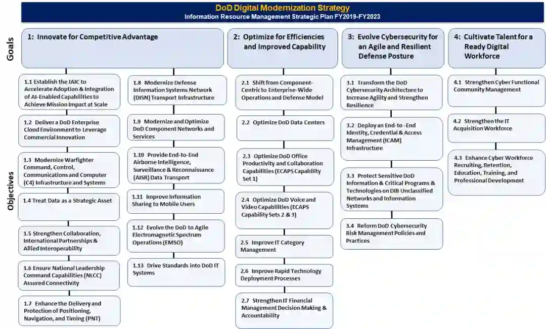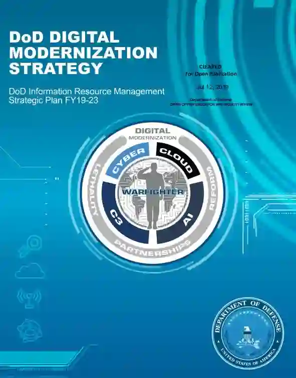 2019年7月12日,美国国防部发布《国防部数字现代化战略》,该文件同时还是《2019财年~2023财年国防部信息资源管理战略计划》。该战略制定的顶层依据是美国《国家安全战略》和《国防战略》,同时该战略又是美国国防部IT现代化领域一系列其他战略文件的顶层指导性文件,包括已经发布的《国防部人工智能战略》、《国防部云战略》,以及正在撰写中的《国防部网络风险战略》、《国防部IT改革战略》、《国防部指控与通信现代化战略》。