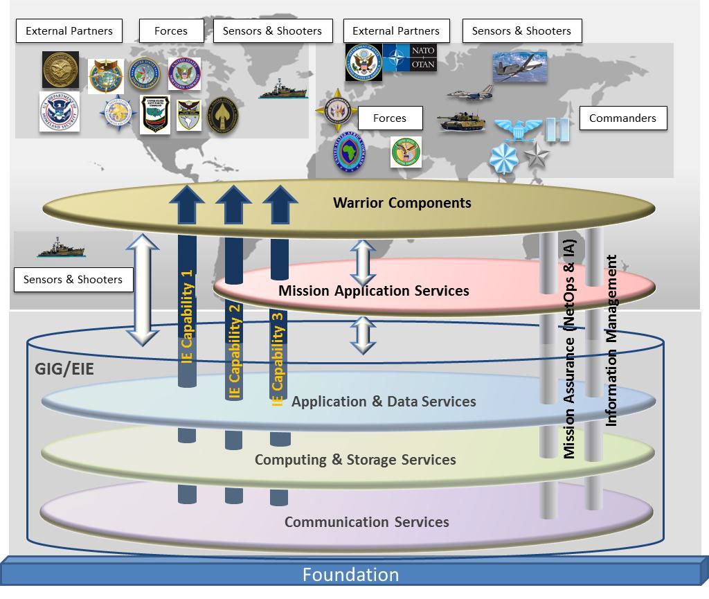 随着GIG的建设成型,其实施过程中也出现了一些新的问题如军兵种之间兼容性(“烟囱管”)对联合作战的影响、带宽的问题、国防预算压缩对可持续建设的影响等,另外新的信息技术和应用服务理念也在发生巨大变化,特别是云计算、移动终端等革命性技术。因此美军又提出了对现有信息技术进行现代化的问题,即联合信息环境(JIE)建设。可见,GIG是美军为网络中心战建设的重要基础设施,而JIE是美军基于安全性考虑,对整个GIG及后续国防部信息网重新设计而提出的一个概念。另外,国防部信息企业体系架构(DoD IEA)可视作是美国国防部企业信息环境转型的总体指导性文件,是传统信息环境向JIE转型的理论与制度依据。DoD IEA中的关键要素(通信网络、运算能力、数据服务、网络安全等)都可以在JIE中找到对应之处。(2)JIE和DoD IEA发展历程