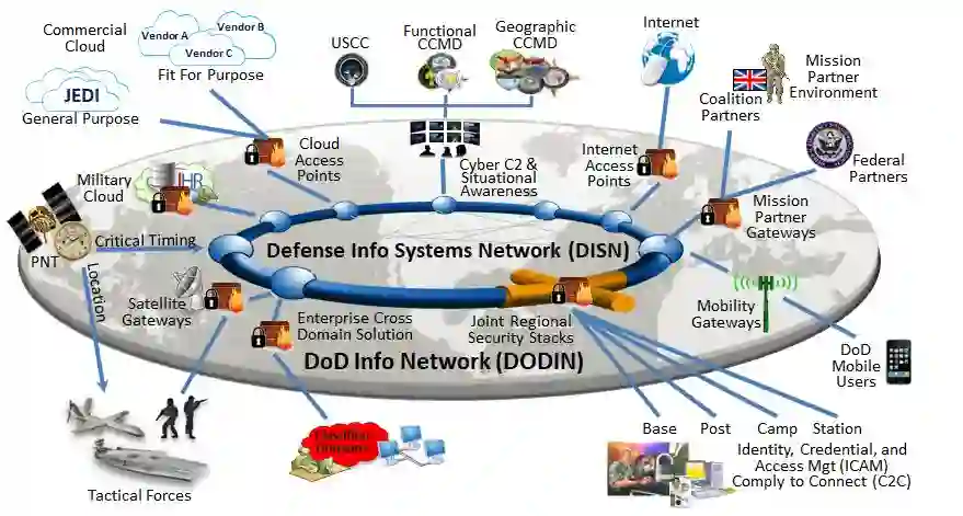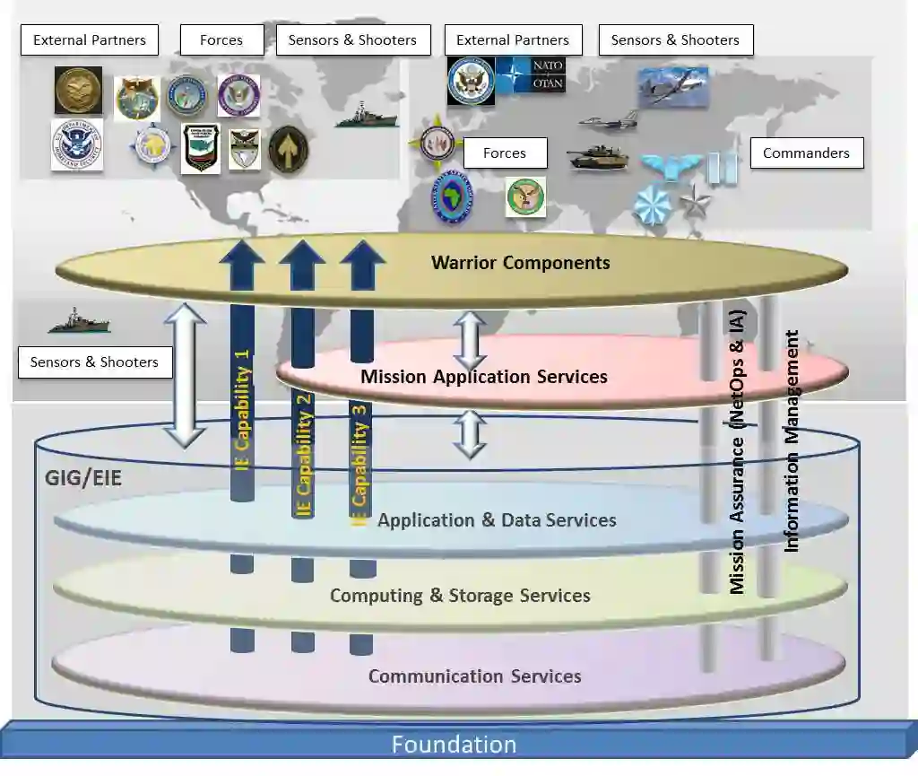 近十多年来,信息技术领域取得了快速发展,一些有望对信息领域产生巨大影响的新技术不断涌现,如,人工智能、云计算、软件定义无线电与软件定义网络等。这些新技术的涌现与应用,使得网络中心战理念的前提条件(即“全连通网络”)越来越难以具备,网络中心战理念转型势在必行。关于网络中心战当前面临的困境,可总结为一句话:战场环境的诸多约束让战场网络无法满足“全连通”这一网络中心战的前提条件。所谓“全连通”,大致可以细化为如下几方面特点:网络以及网络中的任何节点都拥有近乎无限的带宽/数据速率和处理能力;网络以及网络中的任何节点都有权限共享网络中的任何信息;网络中的任何节点之间的信息与指令传输都以网状实现。然而,在以电磁波为主要传输介质的数字化战场上,这些前提几乎都不具备,因为该战场具备如下几方面鲜明特征,而这些特征都在阻碍着“全连通”能力的实现:带宽资源始终稀缺;处理资源大多有限;数据体量没有上限;信息共享难跨密级;指控关系必须分层。为应对上述诸多挑战,美国军方提出了一系列新理念、开发了一系列新项目,以对网络中心战理念进行“修正”。最典型的项目就联合信息环境(JIE),该环境包含共享的信息技术基础设施、企业级服务和单一安全架构(SSA),可确保全谱优势,改善任务效能,提高安全性,实现信息技术效能。(二)基础设施背景:打破现有基础设施的“烟囱管”