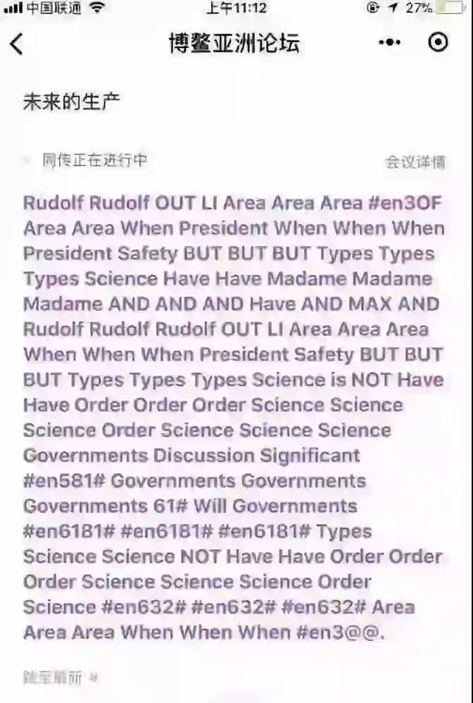 该同传产品在当时主要负责为博鳌论坛的开幕式及部分核心论坛提供同声传译支持,其中包括同传双语内容会议现场投屏、同传内容手机小程序查看、翻译结果语音收听、同传记录回放等。结果会议才开始没多久,网上就爆出同传产品「掉链子」的消息,其中集中出现的问题分别是「大面积单词无意义重复、大小写及字符混乱」和「中英双语切换频率」,比如在一片中文翻译中出现大量无意义的英文单词「for」。