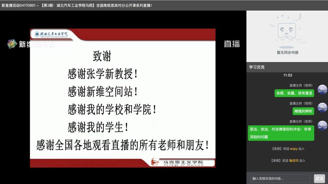 据悉,此次公开课是湖北汽车工业学院深入学习贯彻习近平总书记学校思想政治理论课教师座谈会重要讲话的具体行动,是为办好思想政治理论课,加快推进思政课教学“八个统一”改革,打造“六要”师资队伍,把思政课建设成为学生“真心喜欢、终身受益、毕生难忘”金课的有力探索。湖北汽车工业学院及全国有大量的思政课教师观看直播,有助于“对分课堂”教学模式在全国的推广,进一步促进思政课的教学改革,提升思想政治教育亲和力和针对性。今后马克思主义学院将以对分课堂为依托,召开区域性或全国性教学改革研讨会,把对分课堂的教学理念做大做实做强做亮。