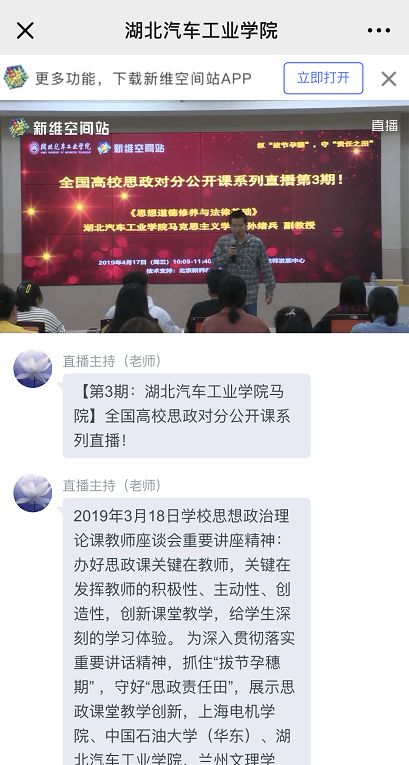 本系列教学直播源于上海电机学院、中国石油大学(华东)、湖北汽车工业学院、兰州文理学院、天水师范学院等高校马克思主义学院联合“对分课堂”创始人、复旦大学社会发展与公共政策学院张学新教授,以“室联网”新维空间站和MOOC公号为平台,在全国范围首推基于对分课堂新型教学模式、真实课堂情境下的思政课系列直播活动。