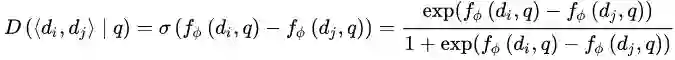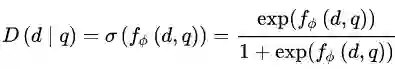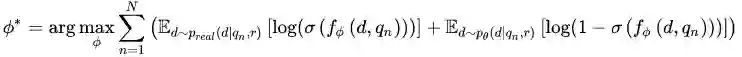 在 IRGAN 中,鉴别器 D 定义为判别式 IR 模型的逻辑回归: