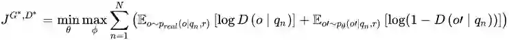 IRGAN 在 Pairwise 情形下的总目标函数如下,其中, o 表示真实的非对称二元组,而 o' 则表示生成式 IR 模型生成的二元组: