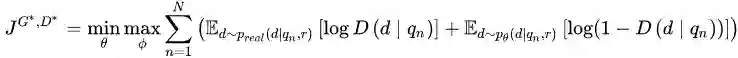 相对地,生成器 G 就直接输出以 query 为 condition 答案池中所有 document 与该 query 的关联分布,不幸地,我们必须将通过这个关联分布,过滤出当前认为最相关的 document 答案,才能作为鉴别器 D 的输入来判定此时此刻检索结果的质量,原本连续型的分布经过这一步的折腾又变成离散型的数据了,还好, 我们有强化学习,设 ,则生成器 G 的目标函数被写成: