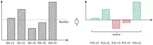实际上,在强化学习的对话生成模型当中,就已经出现了此类问题。解决的方法很简单,我们设置一个奖励值 Reward 的基准值 Baseline,每次计算奖励值的时候,在后面减去这个基准值作为最终的 奖励 or 惩罚 值,使得生成器 G 的生成结果每次得到的奖惩有正有负,显得更加分明。记奖惩基准值为 b,则 4.1 节中优化梯度的计算公式修改为: