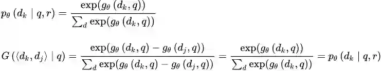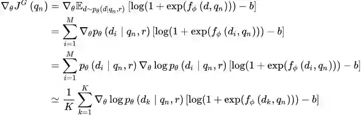 也就是最大化鉴别器 D 给出的奖励,而这个奖励值主要来源于检索结果形成的查询对 在判别式 IR 模型中被认为确实有关联的概率之和。将求和符号内的项记作: