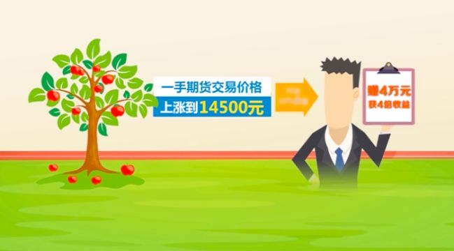简单的说,投资者只需要用10500元的合约保证金,就能撬动105000元的苹果期货合约。期货价格上涨到14500元,也就是合约上涨到了145000元,投资者就实现了40000元的盈利,获得4倍的收益。