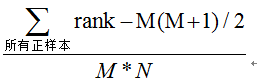 第三种方法:与第二种方法相似,直接计算正样本score大于负样本的概率。我们首先把所有样本按照score排序,依次用rank表示他们,如最大score的样本,rank=n(n=N+M),其次为n-1。那么对于正样本中rank最大的样本,rank_max,有M-1个其他正样本比他score小,那么就有(rank_max-1)-(M-1)个负样本比他score小。其次为(rank_second-1)-(M-2)。最后我们得到正样本大于负样本的概率为