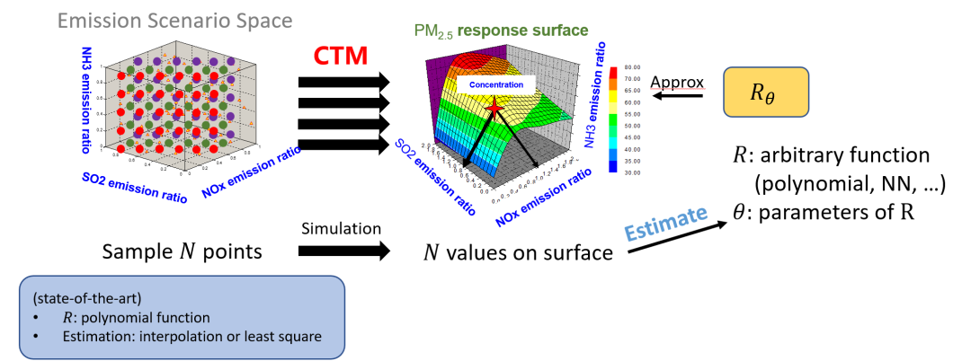 然而 CTM 模型的计算量庞大(求解偏微分方程进行时间维度的连续积分),耗时耗力,完成一次模拟往往需要使用超算集群运行1-2周才能完成,因此时效性也很差。更重要的是,有害气体排放的种类可能多达十余种甚至更多,因此往往需要采样非常多不同的减排方案并使用 CTM 模型进行模拟,才能对响应曲面有一个较准确的近似,而这往往是实际决策时所不能承受的。