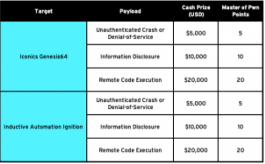 假设黑客在Iconics Genesis64(控制服务器)或Triangle Microworks SCADA数据网关(DNP3网关)等产品中找到这些漏洞,将获得最高20000美元的奖金。