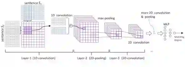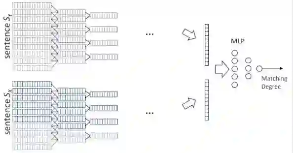最后要介绍的一篇论文是有关于句子匹配(Sentence Matching)的问题,基础问题仍然是句子建模。首先,文中提出了一种基于CNN的句子建模网络,卷积的作用是从句子中提取出局部的语义组合信息,而多个Feature Map则是从多种角度进行提取,也就是保证提取的语义组合的多样性。分别单独地对两个句子进行建模(使用上文中的句子模型),从而得到两个相同且固定长度的向量,然后,将这两个向量作为一个多层感知机(MLP)的输入,最后计算匹配的分数。