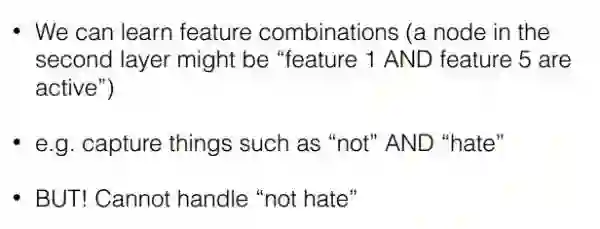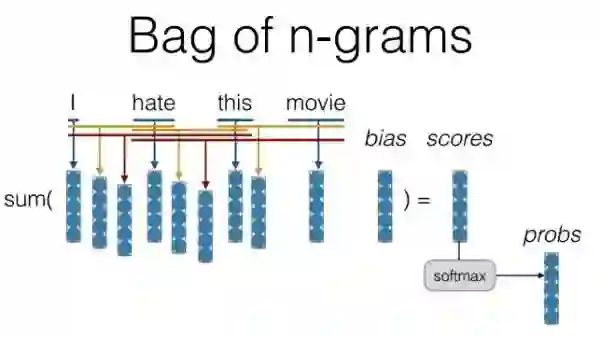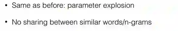 在语言模型里n-gram模型是可以用来解决,想法其实就是将连续的两个词作为一个整体纳入到模型中,这样确实能够解决我们刚才提出的问题,加入bi-gram,tri-gram可以让我们捕捉到例如“don’t love”,“not the best”。但是问题又来了,如果我们使用多元模型,实际训练时的参数是一个非常大的问题,因为假设你有20000个词,加入bi-gram实际上你就要有400000000个词,这样参数训练显然是爆炸的。另外一点,相似的词语在这样的模型中不能共享例如参数权重等,这样就会导致相似词无法获得交互信息。