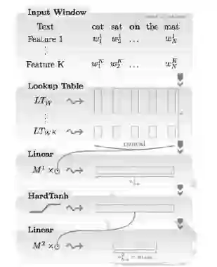 首先我们来介绍第一篇论文《Natural Language Processing (almost) from Scratch》,该论文主要是针对原来那种man-made 的输入特征和人工特征,利用神经网络的方法自动抽取出文本句子更高级的特征用来处理自然语言处理里的各项任务,例如本文中输入是一个句子序列,输出是对句子中各个词的词性的预测。该文提出了两种方法,一种是滑动窗口的方法(window approach),另一种就是将整个句子作为输入(sentence approach)的方法,两种方法就分别对应着局部和全局的特征。模型结构如下图所示: