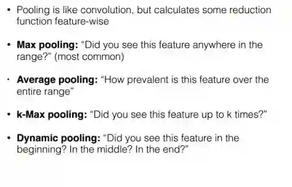 刚才这篇论文实际上是在池化层中直接选择了最大池化,接下来的这篇论文《A Convolutional Neural Network for Modelling Sentences》对句子级别特征的池化过程进行了改进并且提出了DCNN动态卷积网络(Dynamic Convolutional Neural Network),在介绍该论文前首先先来介绍一下常见的几种池化方式。