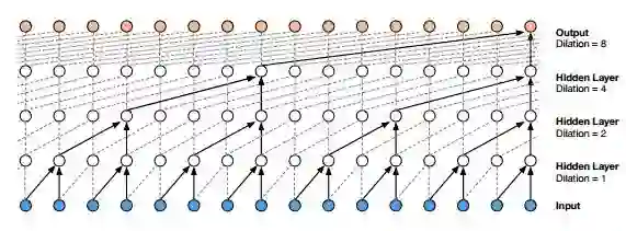 刚才这篇论文是对池化过程进行改进,接下来的两篇论文是对卷积层进行了改进。第三篇论文是《Neural Machine Translation in Linear Time》,该论文提出了扩张卷积神经网络(Dilated Convolution)应用于机器翻译领域。Dilated convolution实际上要解决的问题是池化层的池化会损失很多信息(无论该信息是有用还是无用)。Dilated convolution的主要贡献就是,如何在去掉池化操作的同时,而不降低网络的感受野。下图理解起来更加容易,卷积的输入像素的间距由1-2-4-8,虽然没有池化层,但是随着层数越深覆盖的原始输入信息依旧在增加。也就是我们通常卷积核与输入的一个区域的维度大小保持一致,但是去掉池化层后,我们随着深度增加,卷积核的所能覆盖的输入区域扩展一倍。
