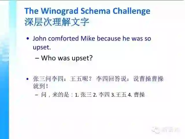 但是,现在人工智能仍然有一些困境,比方说如何能够让人工智能来深层理解文字,有一个著名的类似于图灵测试的比赛,深层次理解文字,在自然语言上问一些有歧异的问题,计算机如果要能正确的回答这个问题,那个模型就不仅仅要理解这些文字,而且要理解深层的背景文字,要理解周边的文字。有很多文化在里面,如何能达到这一点?这也是我们需要解决的。