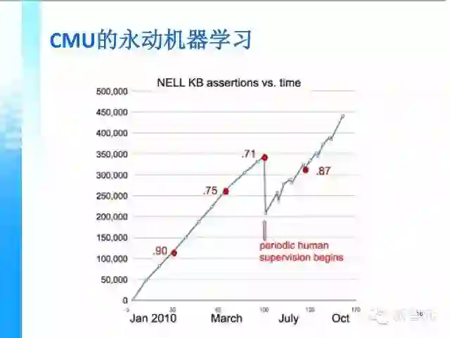 这里我要特别提到一点,我们并不是找到了最后的目标,这也是在不同的人工智能、强化学习等等之类的实验当中我们发现一个特点,就是我们不能完全依靠机器去全部自动化自我学习,至少到现在我们还没有摸索出这样一个路径。这里是CMU大学的例子,用中文来说是永动机器学习,这个机器不断在网上扒一些网页,在每个网页里面都学到一些知识,把这些知识综合起来,变成几千万条知识,这些知识又会衍生新的知识。那么我们看到从下到上是随着时间,知识量在增长。但是它到了某一个程度实际上是不能再往上走了,因为知识会自我矛盾。这个时候就需要人来进行一部分的调节,把一部分不正确的知识去掉,让它继续能成长。这个过程为什么会发生呢?