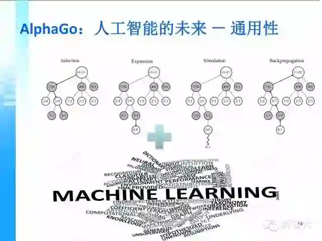 包括现在的AlphaGo也应用了很多自学习的这种效果,使得我们现在终于认清原来人工智能从[20世纪]60年代到2000年的物理符号的假设,也就是说以搜索为中心,以逻辑为中心的这种努力并没有白费,这种努力也是需要的。另外学习也是必不可少的,像我们熟知的深度学习。所以AlphaGo对我们的启示,就是我们把[搜索和学习]两者结合起来,才是一个完整的智能机器。这个我们可以叫做人工智能的通用性,也就是说我们对于这两个技术的某种结合,比方说多一点搜索,少一点机器学习,或者反之我们就可以得到用来解释不同的人类的智能行为。